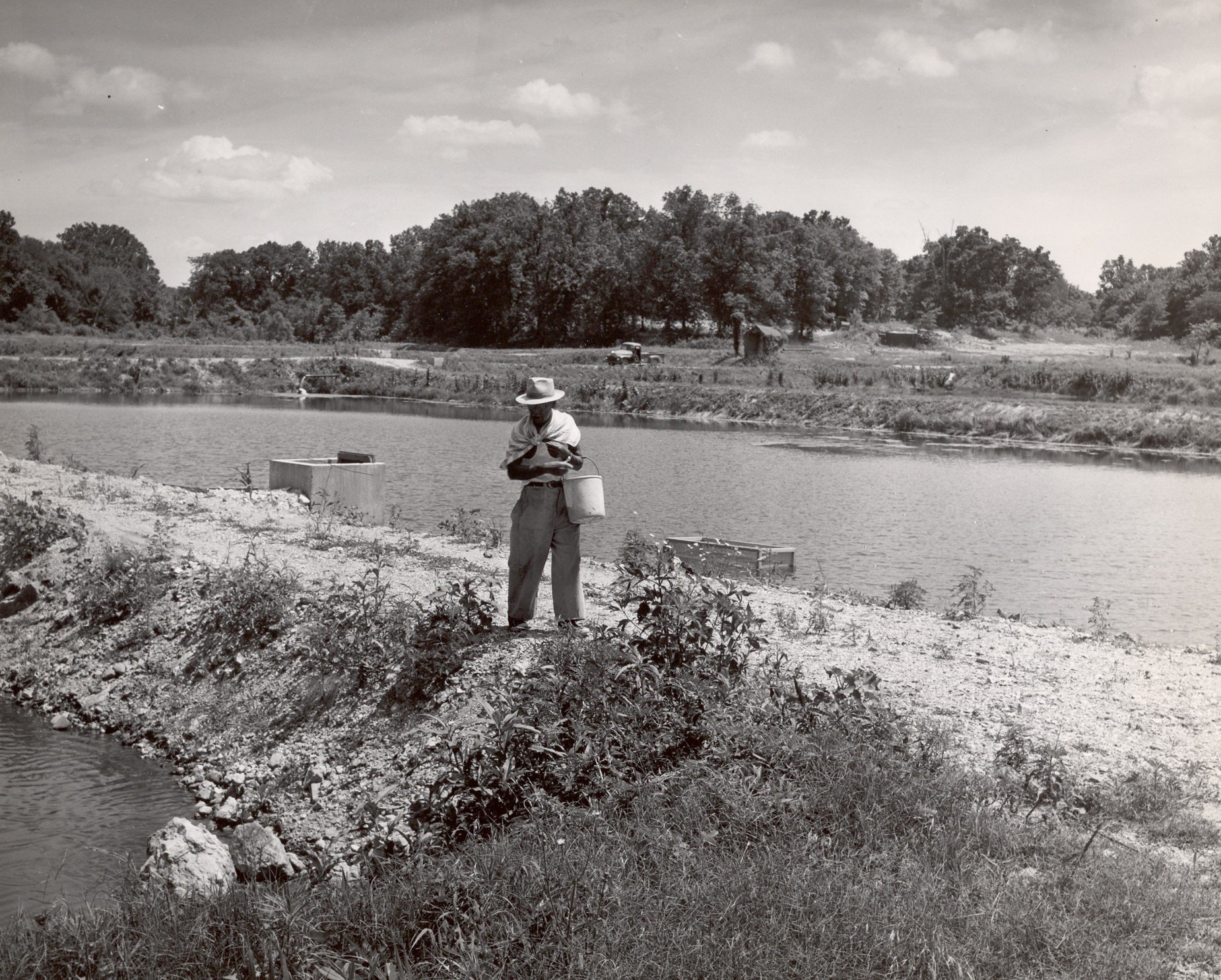 Construction of ponds was performed with horse teams and slip scoops, along with wheelbarrows and shovels. From the early days on, Ozark’s goldfish production included feeder commons, pond comets, calico fantails, black moors, red fantails and shubunkins. By 1936, all the land suitable for pond construction included in the original land purchase had been fully utilized. Adjacent properties were purchased, for expansion but also for the protection of the watershed supplying water to the springs.